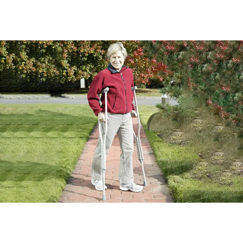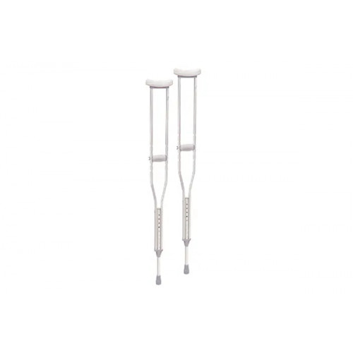 Lighter than wood, this walking crutch by Drive Medical provides stability and durability. Each crutch is manufactured with a double extruded center tube to ensure additional strength on weight-bearing areas. Extra thick (latex free) underarm pads and hand grips provide maximum comfort when in use. Tool free push-button adjustment allows the height of the underarm pad to be easily adjusted in 1" increments. Hand grips adjust separately without tools to ensure a proper fit.